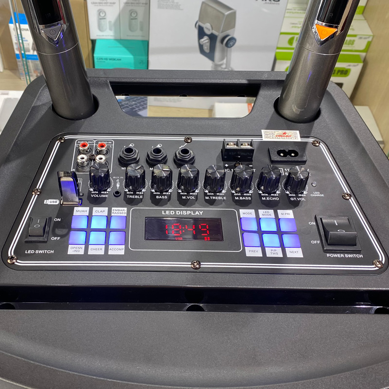 Kết nối USB; TF; FM; Bluetooth kết nối đồng thời 02 thiết bị; LED screen; RCA in; Mic Priority; REC; REP; 1x Mic in; 1x Guitar in; EQ.