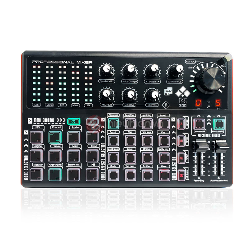 Sound card livestream K300 là chiếc Sound Card mạnh mẽ trong phân khúc được thiết kế tinh tế theo hơi hướng hiện đại cùng với đó là chất liệu nhựa cao cấp ABS điều chỉnh các phím được phân bố phù hợp, cùng với đó K300 tích hợp hệ thống đèn led LGB với nhiều màu sắc bắt mắt tạo điểm đặc biệt sản phẩm.Tùy chỉnh âm sắc từng cổng micro, nhạc cụ riêng biệt, hát trực tiếp bằng micro trên tai nghe điện thoại phổ thông, chế độ Auto-Tune hát hay hơn với nhiều tùy chỉnh tông nhạc theo bài hát.